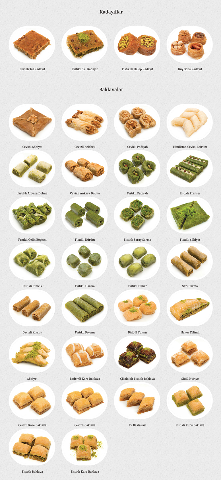 Kaliteli malzeme ve el emeğinin buluştuğu lezzette, baklava ve su böreği çeşitlerinin yanı sıra kır pidesi, kol böreği, spangle, profiterol, kazandibi, keşkül, sütlaç, tel kadayıf ve ekmek kadayıfı üretimi de yapılmaktadır.